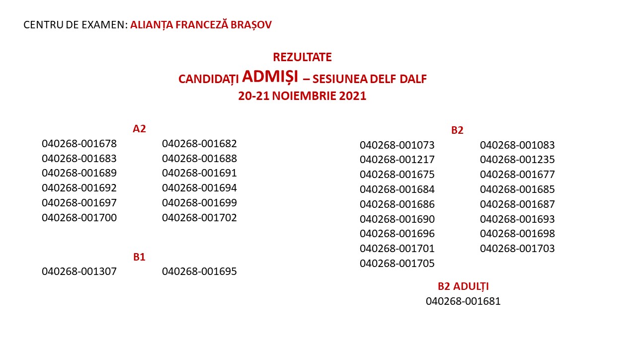 Atestatele de reușită la examenele DELF DALF, sesiunea 20-21 noiembrie 2021 vor fi ridicate de către candidat, pe baza cărții de identitate, de la Alianța Franceză Brașov, în fiecare zi de luni până joi inclusiv, în cadrul PROGRAMULUI CU PUBLICUL, respectiv 10h00-15h30.