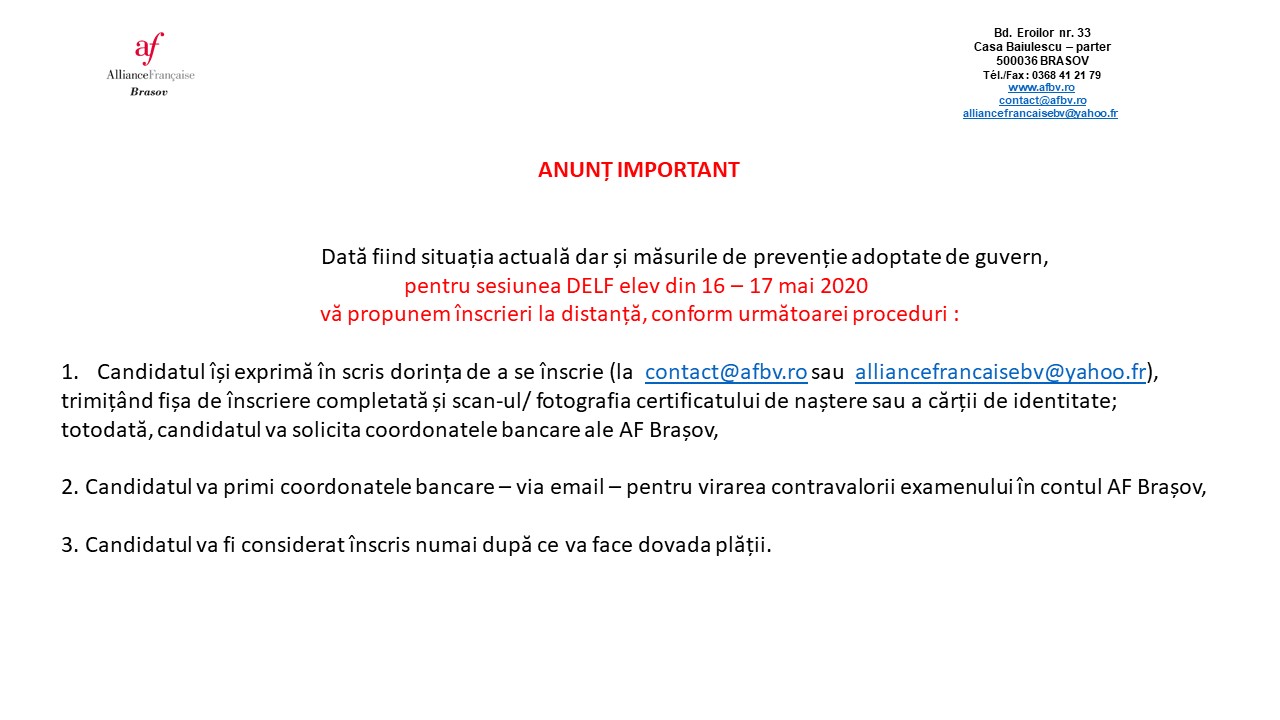Anunț - Examenul DELF elevi din 16 - 17 mai 2020