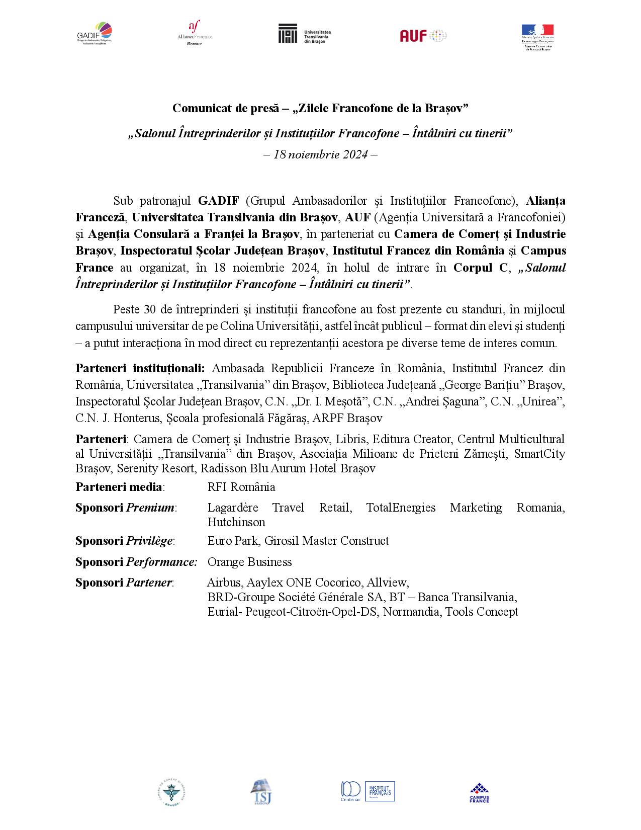 „Zilele Francofone de la Brașov” - „Salonul Întreprinderilor și Instituțiilor Francofone – Întâlniri cu tinerii”, 18 noiembrie 2024