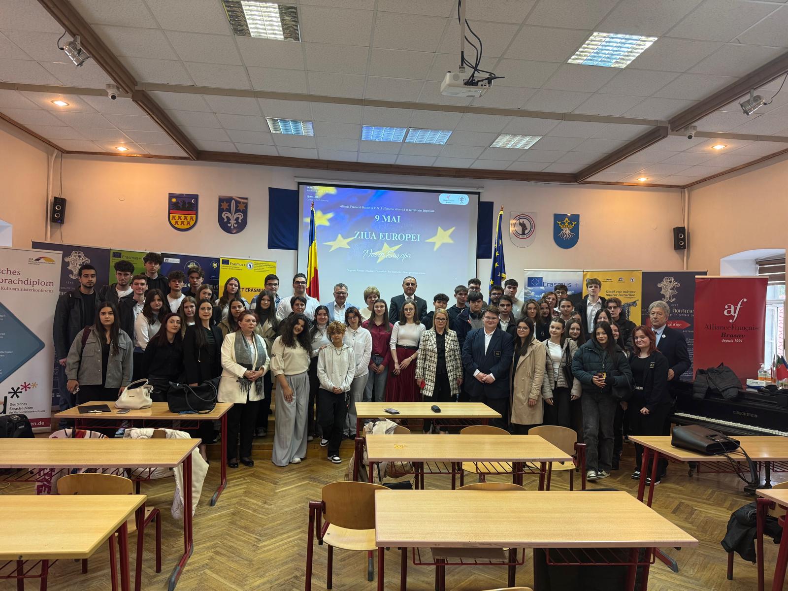 Am sărbătorit astăzi, Ziua Europei la Brașov, în parteneriat cu Colegiul Național „Johannes Honterus”, în sala festivă și după aceea, în curtea acestuia.