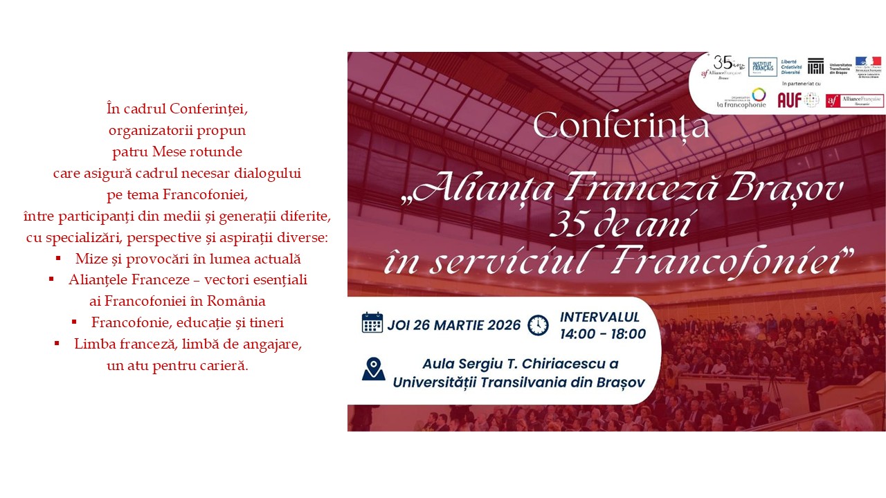 Alianța Franceză Brașov sărbătorește 35 de ani de existență Vă așteptăm la Conferința „Alianța Franceză Brașov - 35 de ani în serviciul Francofoniei” Rețeaua Alianțelor Franceze din România este în sărbătoare!